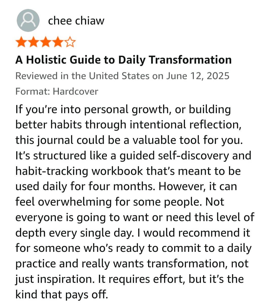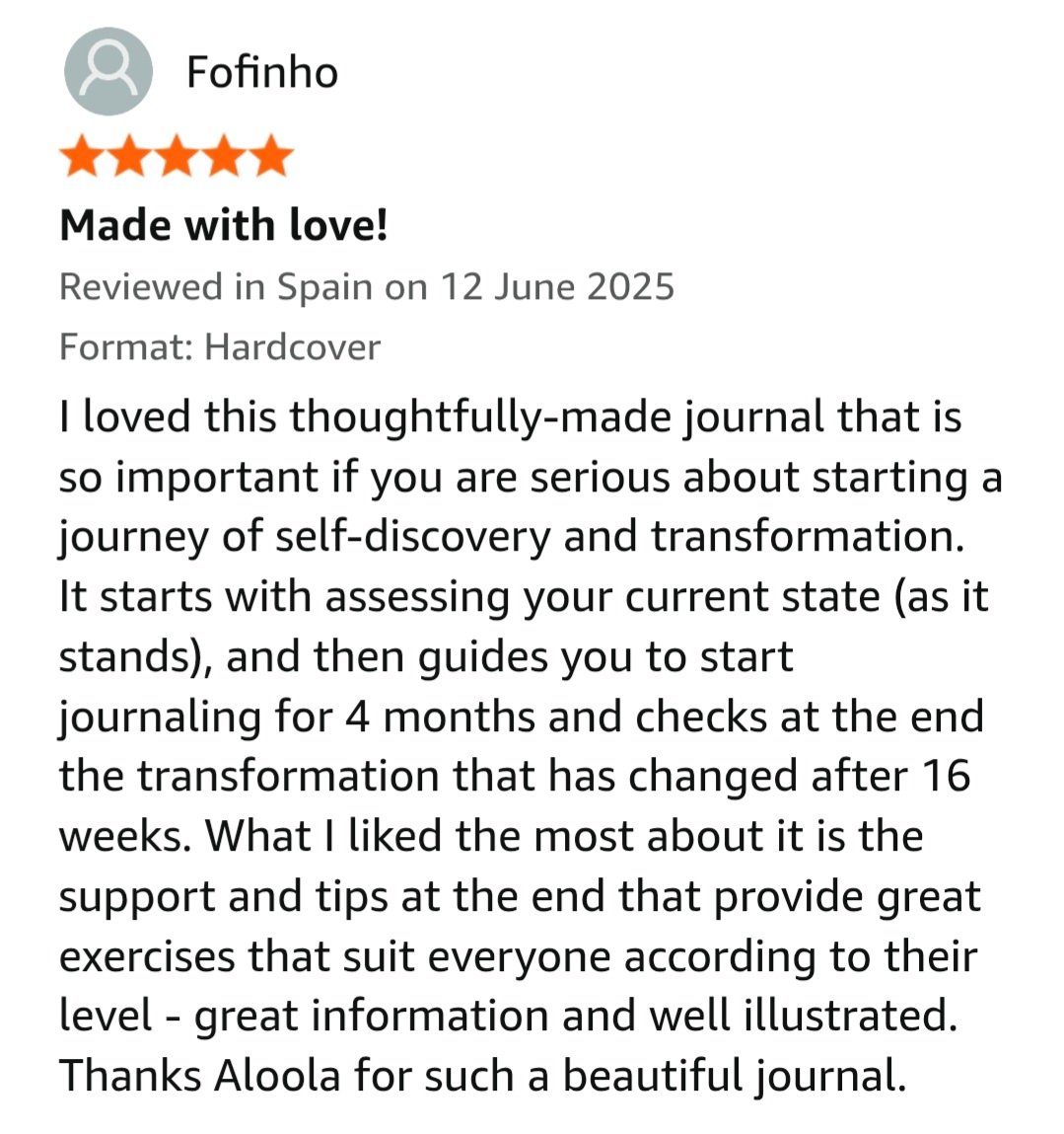 Permanent transformation takes at least 3-6 months, and this journal gives you 4 months of consistent work to create that change. After that you can continue your transformational work or take new 4 months goals depending on where you are at. This journal is easy to start in any time of the year.